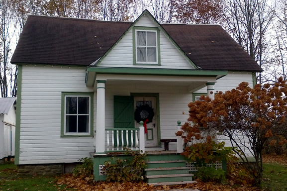 The original tin on the roof has since been replaced with singles. Tin roofs were common in the 1920s and 1930s because of their durability and fireproof quality. The log frame construction (similar to that visible in the Spratt house) was covered over with siding in the twentieth century. This same practice, which gives the house a more "civilized" and affluent appearance, can be seen with the Mainville house (the General Store). Horizontal "shiplap" siding was employed on the Duford house while vertical "board and batten" siding was used on the General Store.