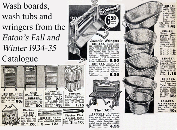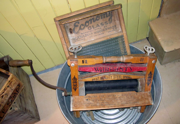 For those who could not afford the gas powered or electric washing machines offered in the Eaton's Fall and Winter 1934-35 catalogue, the traditional economical alternative was the wash board and wash tub. The wringer was a relatively expensive accessory to speed up the drying process. Note the similarities between the "Eatonia" model depicted in the catalogue and the one on display in the museum's A.E. McKeen General Store.
