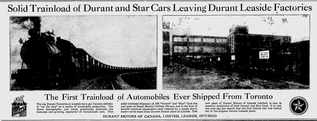 "Solid Trainload of Durant and Star Cars Leaving Durant Leaside Factories." Montreal Gazette. 2 May 1923:9.